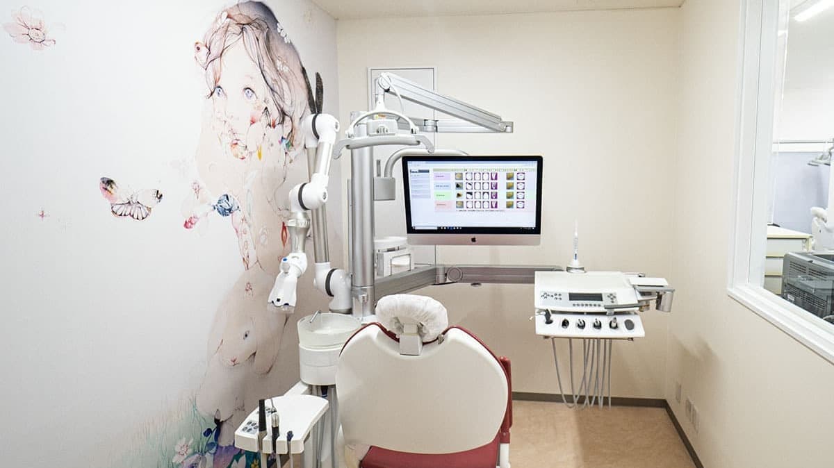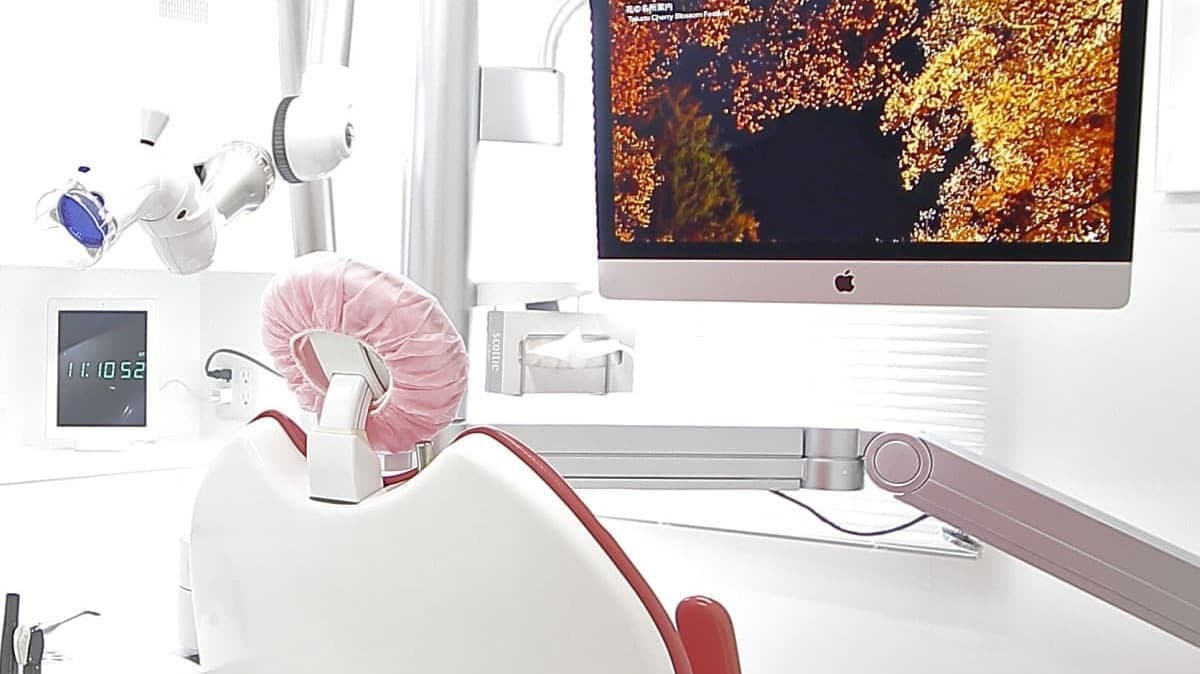 診療室内の各チェアには大きなモニター・口腔内カメラ・口腔外バキュームを設置しています。座ったままの状態で患者さま自身の口腔内のお写真やレントゲンをお見せし、お口の状態についてインフォームドコンセントを行っています。通常は患者さまにリラックスしていただけるように四季折々の動画を流しております。当院では、1995年の開業当初から全てのチェアに口腔外バキュームを設置し、感染対策に加え、院内清潔に努めてきました。皆様に安心して治療を受けていただけるようこれからも努力して参ります。