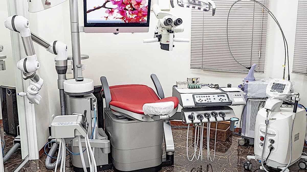 当院は最新機器を常に導入し、業界の最先端を走ってきました。特に審美歯科治療・インプラント・特殊義歯に関しては海外視察をしたり最新機器を海外から購入したりと人材・機材の面でも自信を持っています。診療室の一番奥は個室の特別診療室になっていて、ここには最新機器が詰め込まれています。2023年に大型モニターを追加設置しました。